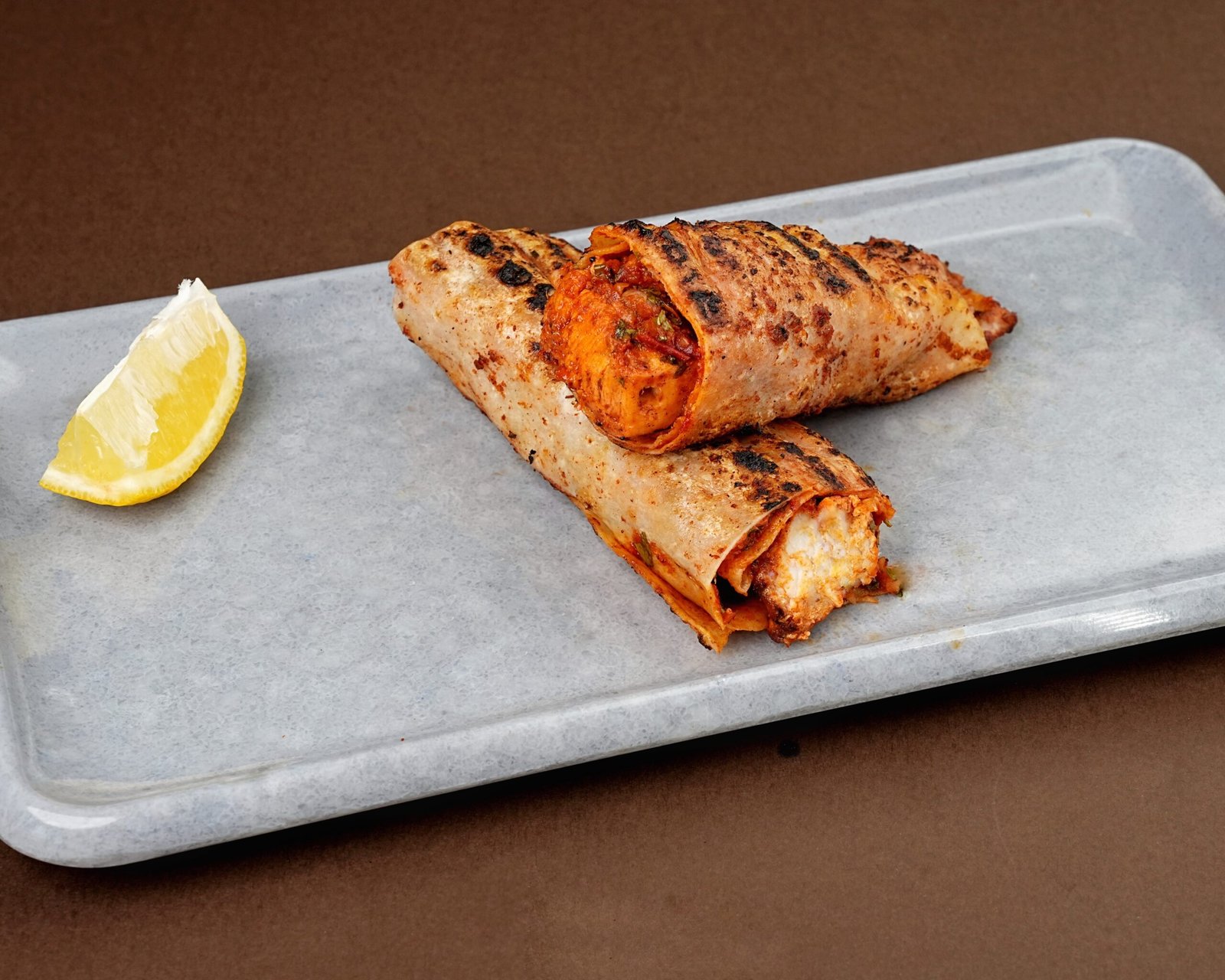 كباب دجاج ملفوف بالخبز التركي ، طماطة ، بصل سماق ، كرفس ، صوص خاص