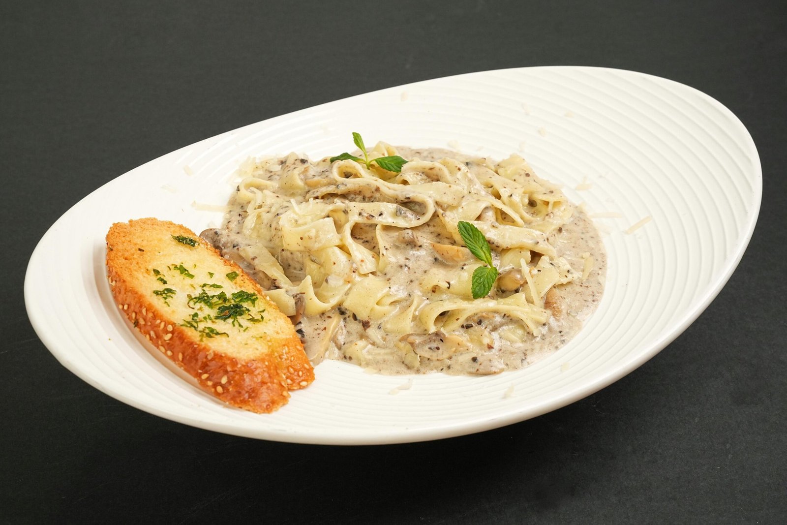 فيتوتشيني بالصوص الكريمي ، صوص الترافل ، فطر طازج ، زيت زيتون ، جبن بارميزان