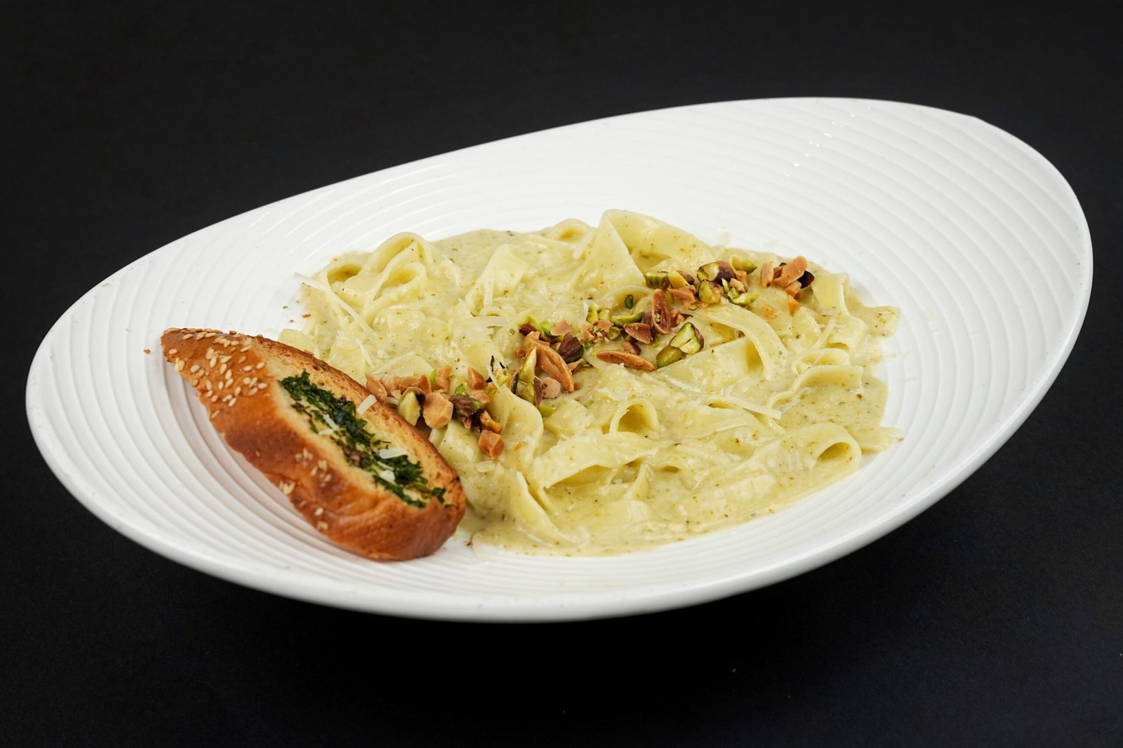 فيتوتشيني بالصوص البيستو الخاص ، صنوبر ، صوص الكريمي ، زيت زيتون ، جبن بارميزان