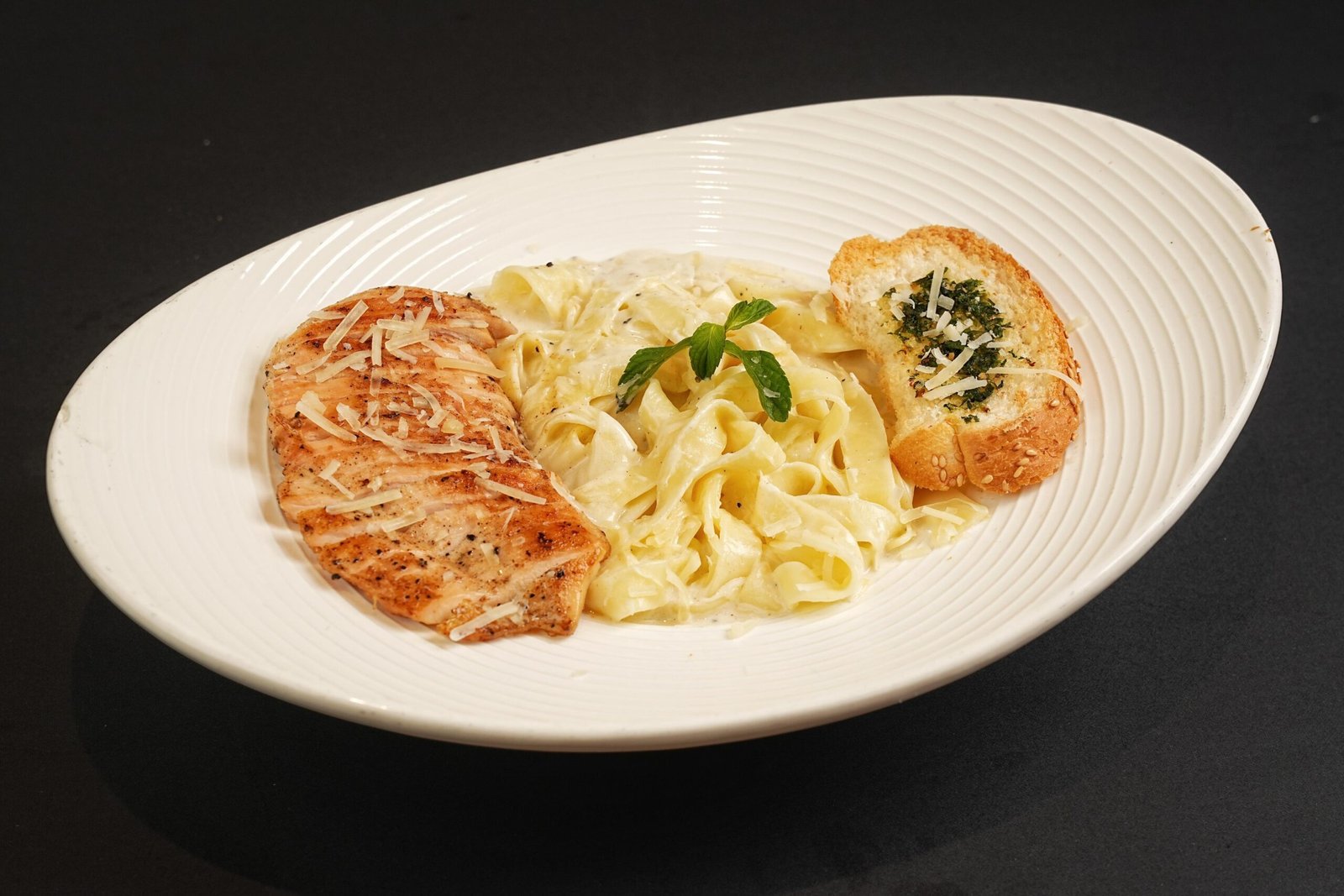 فيتوتشيني بالصوص الكريمي ، صدر الدجاج المشوي ، زيت زيتون ، جبن بارميزان