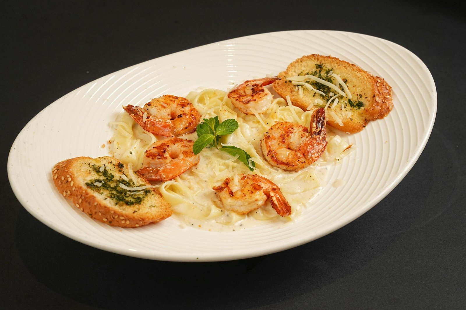 فيتوتشيني بالصوص الكريمي ، روبيان الطازجة ، زيت زيتون ، جبن بارميزان