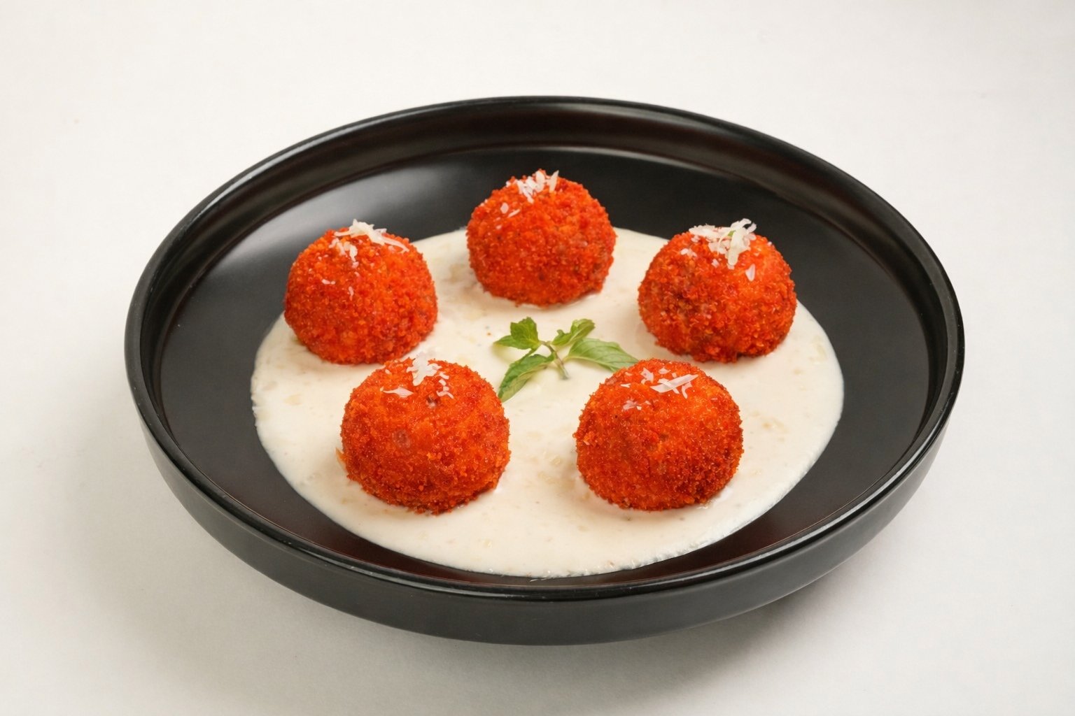 خمس كرات مقرمشة محشوة بالمعكرونة والدجاج والصوص الكريمي وجبنة الموزاريلا ومغلّفة بطبقة من البانكو المقرمش