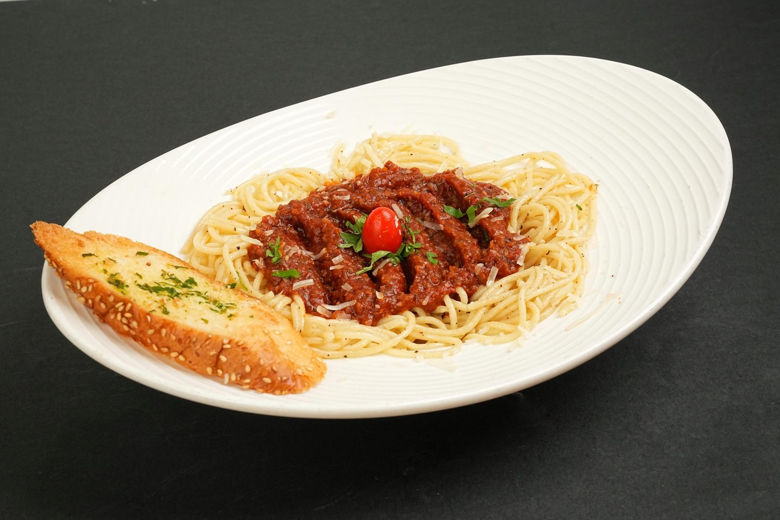 سباغيتي مع صلصة بولونيز غنية باللحم البقري الطازج ، زيت زيتون ، جبن بارميزان