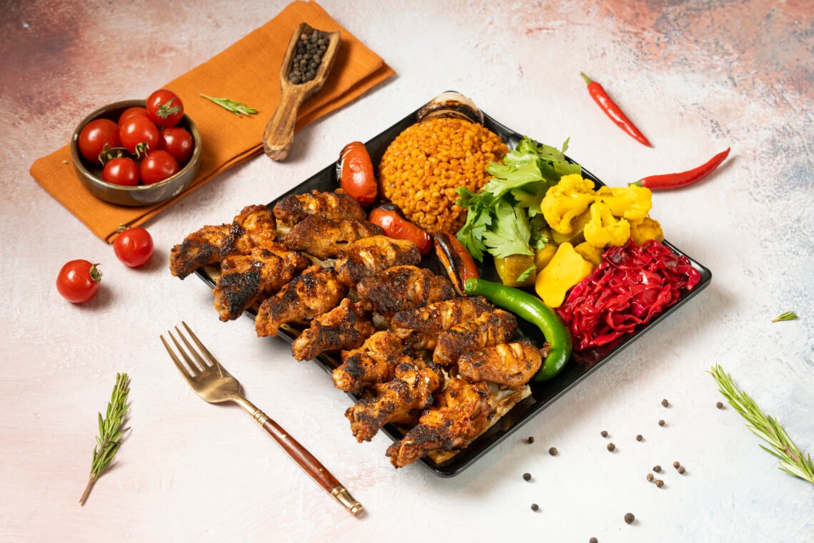 اجلى ازمة , جاجيك, برغل , طماطة مشوية, بصل مشوي, بصل سماق, لهانة حمرا ومخلل , ليمون , فلفل
