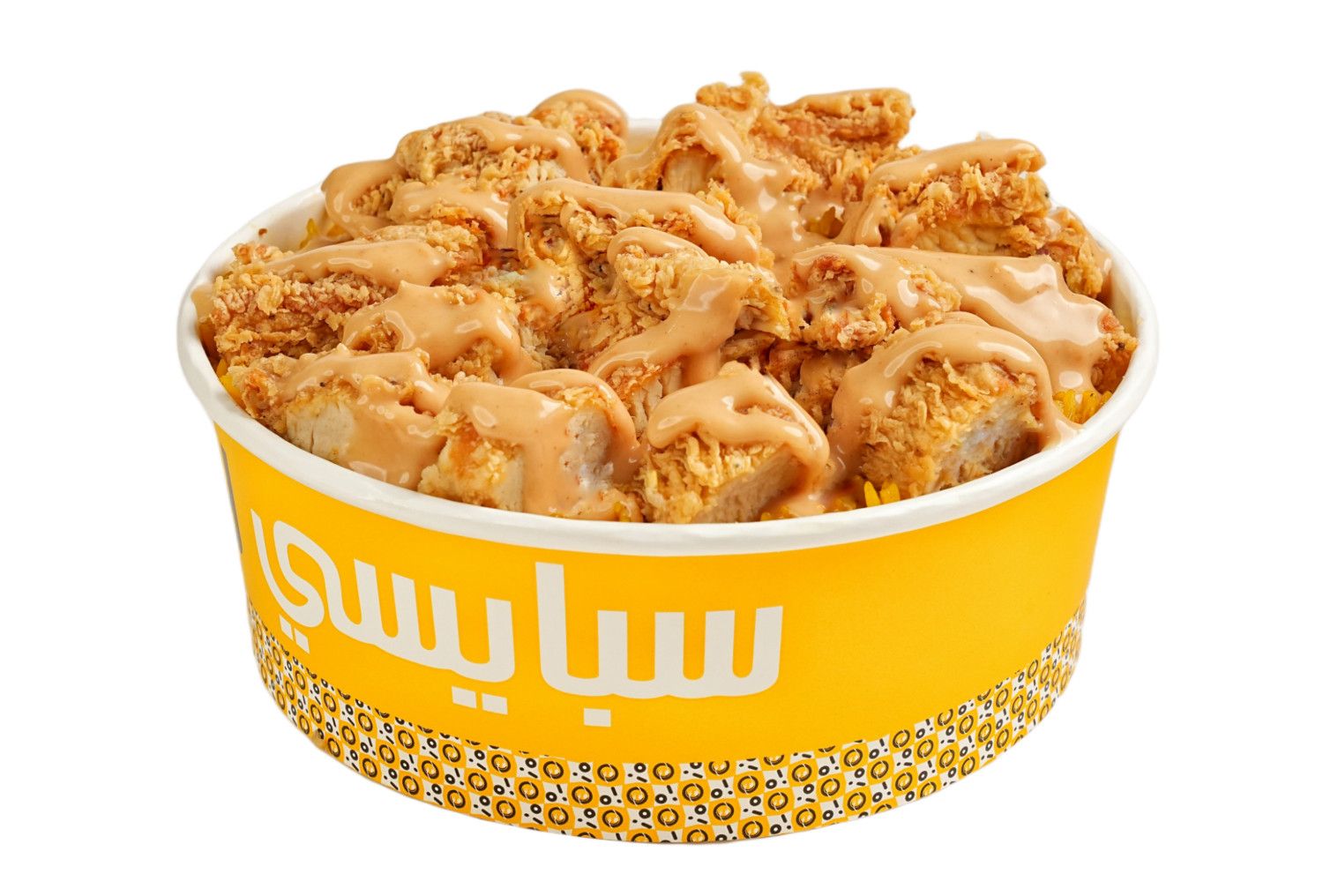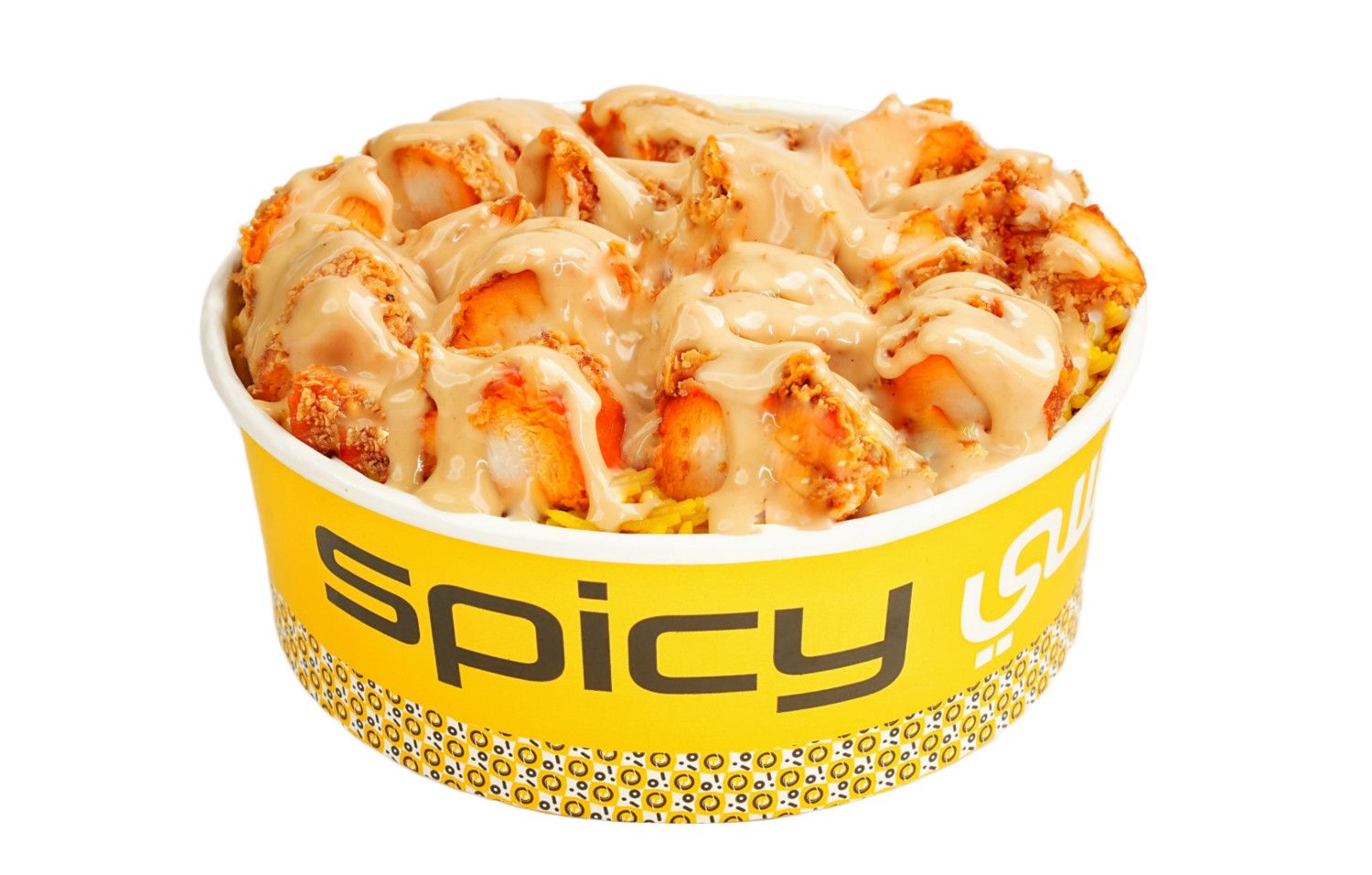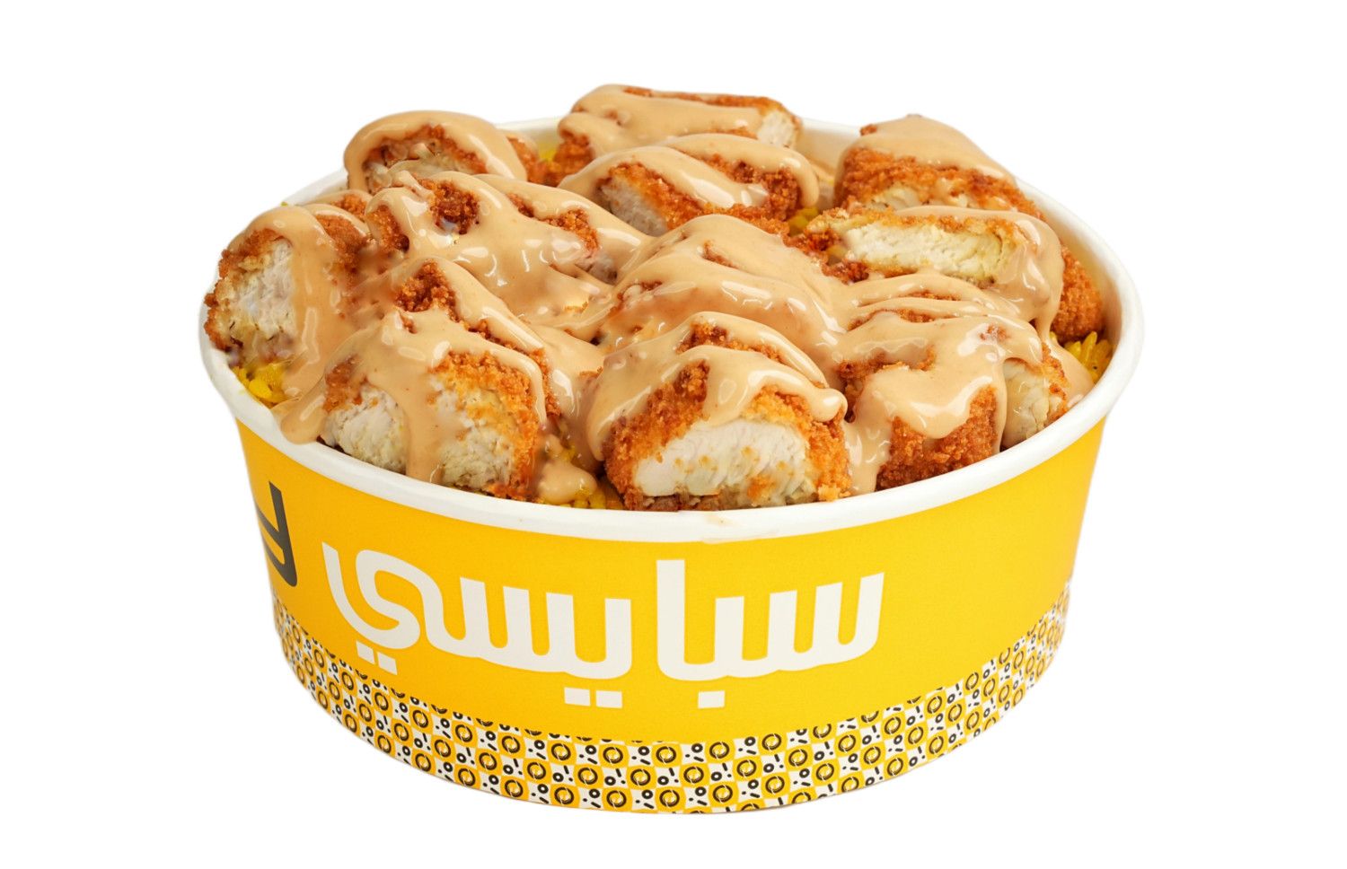 قطع الدجاج "بطعم الحاد" مغلفة بطبقة مقرمشة من دقيق الحنطة مع الرز المميز و صوصات اللذيذة (سويت تشيلي + ميغ ما)