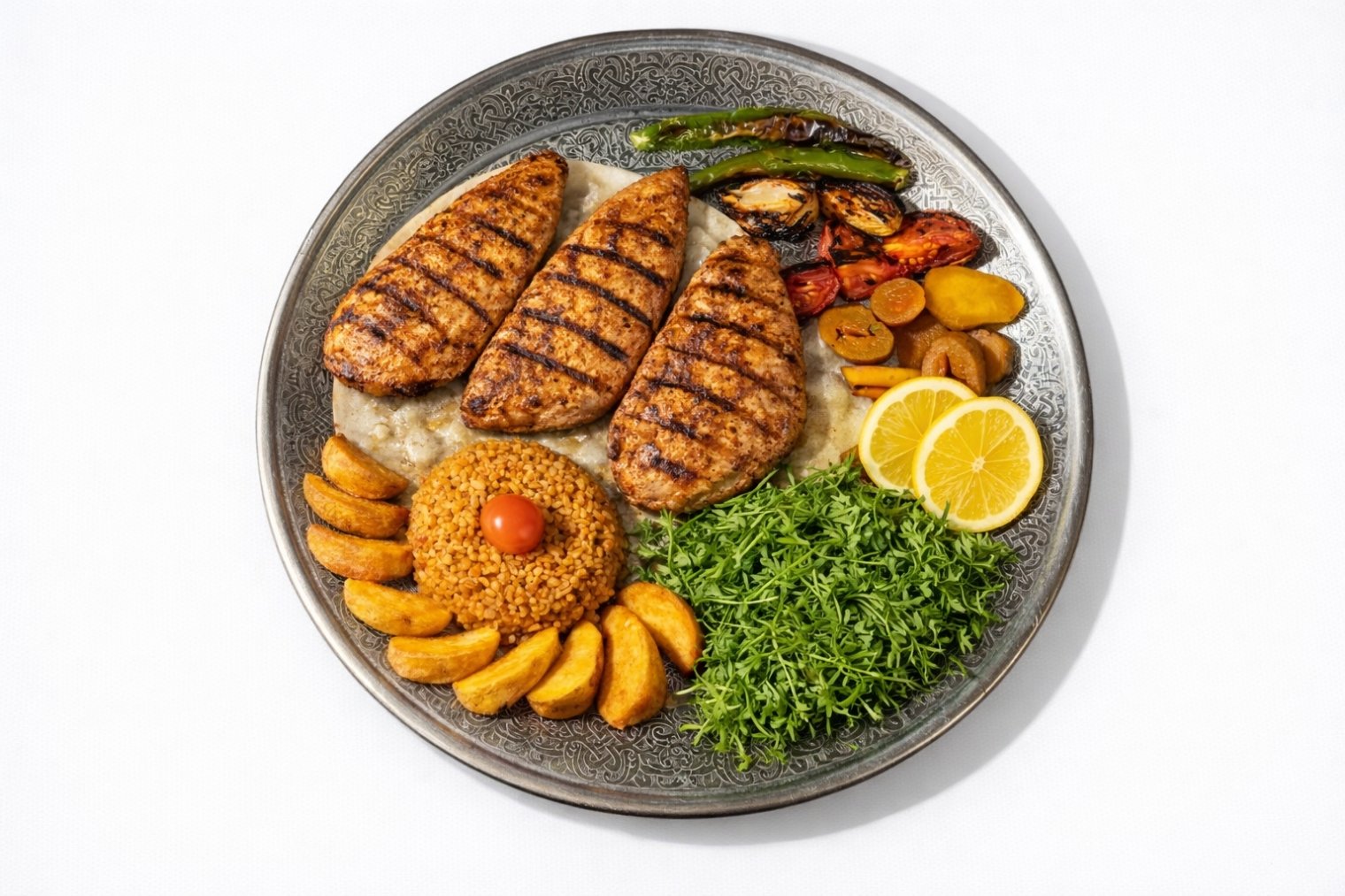 ستيك دجاج مشوي ، برغل ، بطاطا ودجز ، طماطة مشوية ، فلفل مشوي ، بصل مشوي ، رشاد ، ليمون